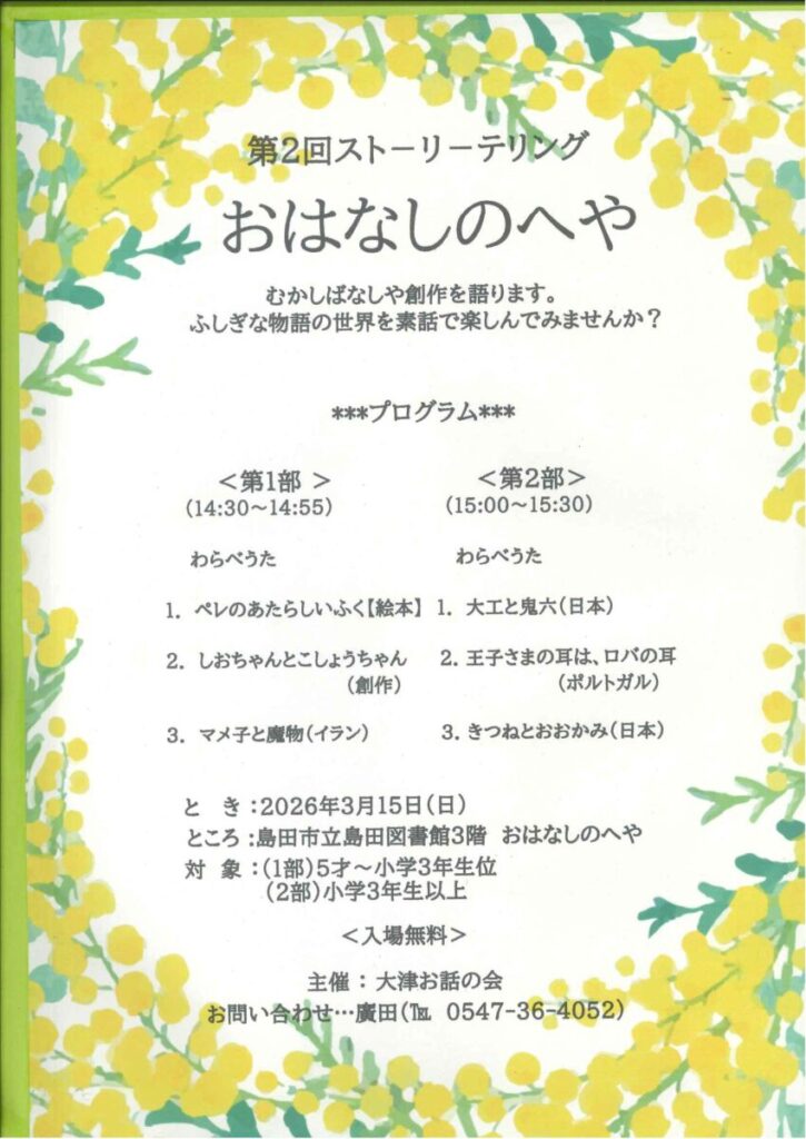 島田図書館「大津お話の会ストーリーテリング」~物語の世界を素話で楽しんでみませんか?~